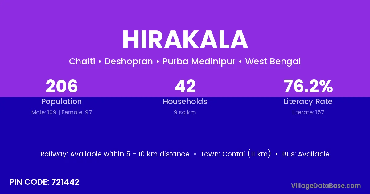 Contai (11 km) is the nearest town to Hirakala village for major economic activities and is located approximately 11 km away.