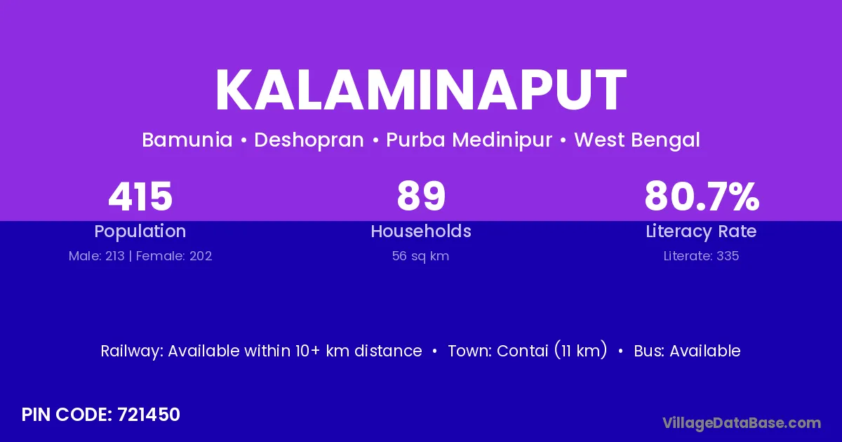 Kalaminaput village is located in the Deshopran Subdivision of the Purba Medinipur district in West Bengal.