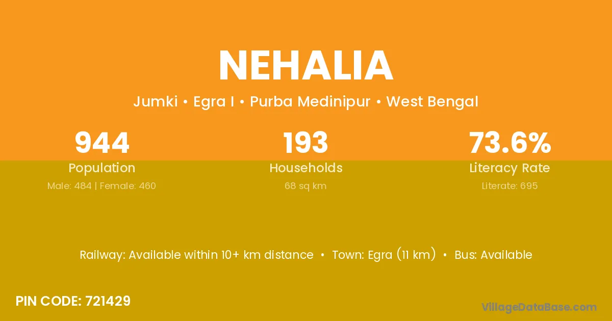 Egra (11 km) is the nearest town to Nehalia village for major economic activities and is located approximately 11 km away.