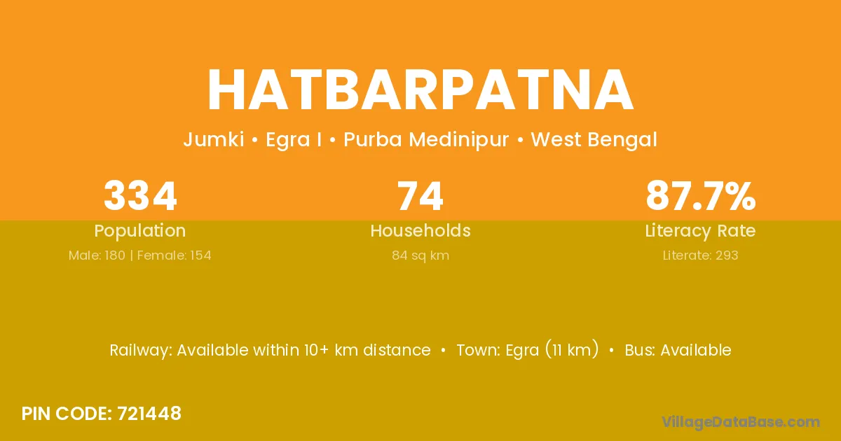 Egra (11 km) is the nearest town to Hatbarpatna village for major economic activities and is located approximately 11 km away.