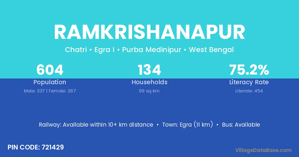 Egra (11 km) is the nearest town to Ramkrishanapur village for major economic activities and is located approximately 11 km away.