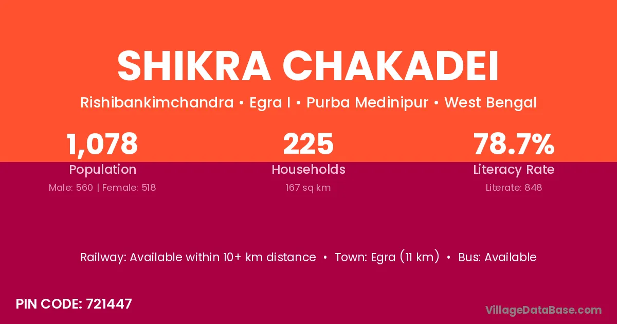 Egra (11 km) is the nearest town to Shikra Chakadei village for major economic activities and is located approximately 11 km away.