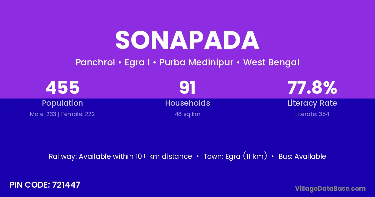 Egra (11 km) is the nearest town to Sonapada village for major economic activities and is located approximately 11 km away.