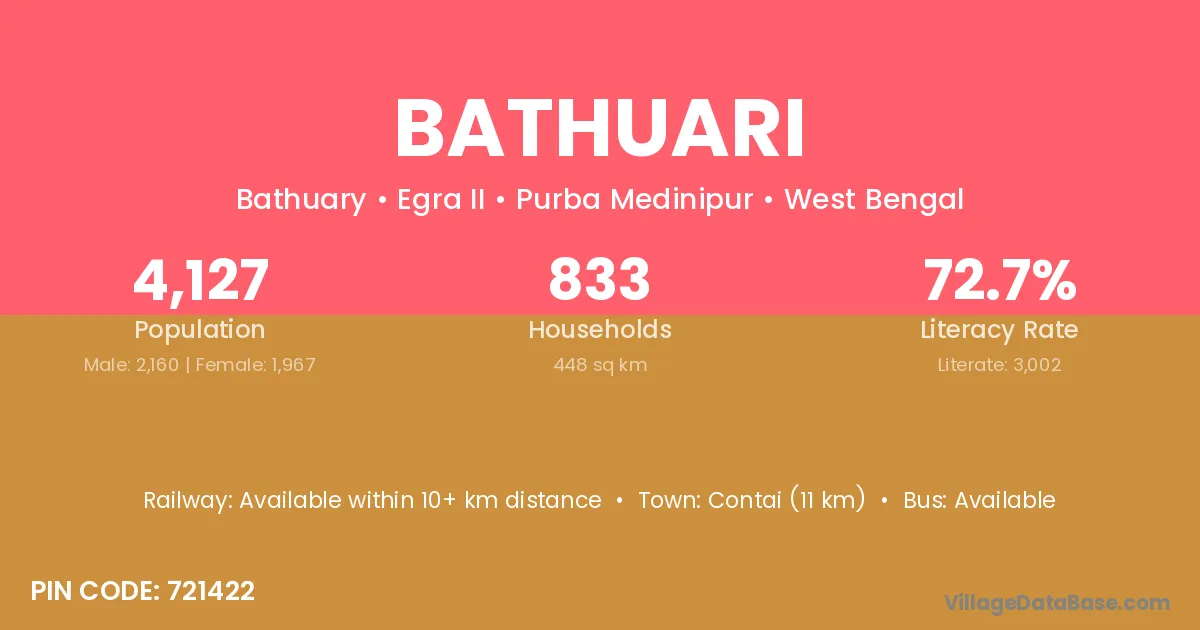 Contai (11 km) is the nearest town to Bathuari village for major economic activities and is located approximately 11 km away.