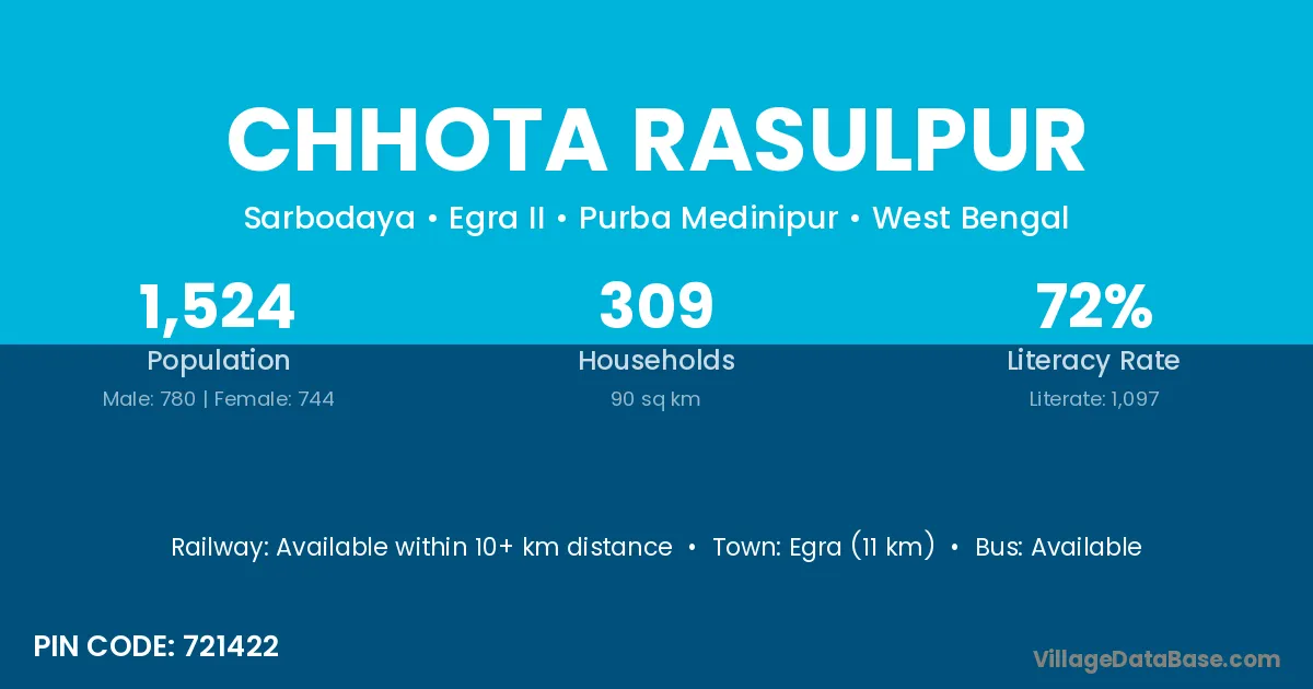 Egra (11 km) is the nearest town to Chhota Rasulpur village for major economic activities and is located approximately 11 km away.
