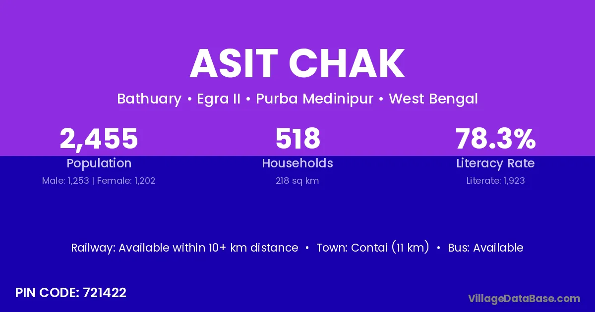 Contai (11 km) is the nearest town to Asit Chak village for major economic activities and is located approximately 11 km away.