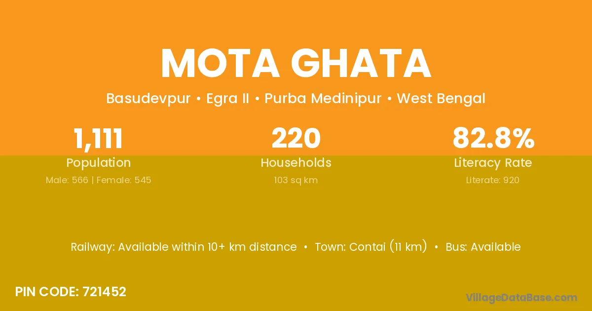 Contai (11 km) is the nearest town to Mota Ghata village for major economic activities and is located approximately 11 km away.