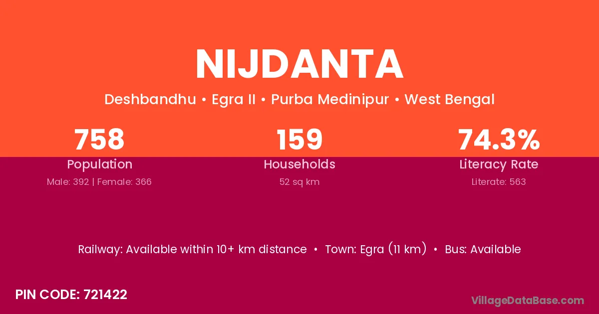 Egra (11 km) is the nearest town to Nijdanta village for major economic activities and is located approximately 11 km away.
