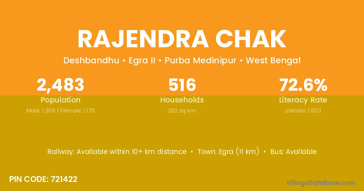 Egra (11 km) is the nearest town to Rajendra Chak village for major economic activities and is located approximately 11 km away.