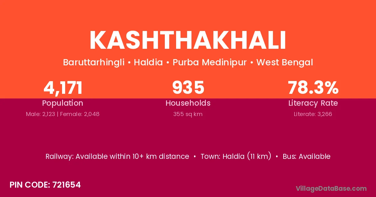 Haldia (11 km) is the nearest town to Kashthakhali village for major economic activities and is located approximately 11 km away.