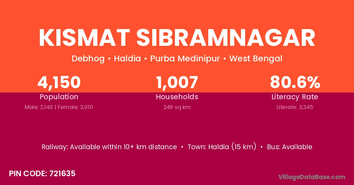 Haldia (15 km) is the nearest town to Kismat Sibramnagar village for major economic activities and is located approximately 15 km away.