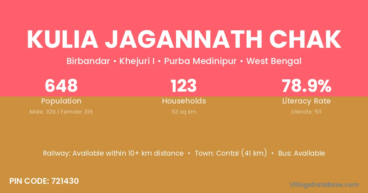 Contai (41 km) is the nearest town to Kulia Jagannath Chak village for major economic activities and is located approximately 41 km away.
