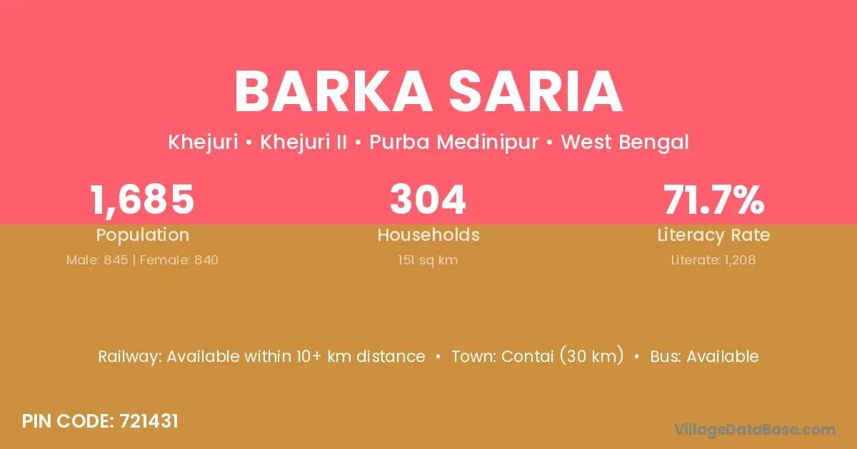 Contai (30 km) is the nearest town to Barka Saria village for major economic activities and is located approximately 30 km away.