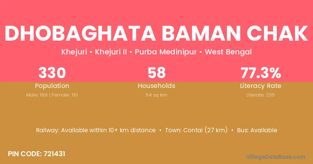 Contai (27 km) is the nearest town to Dhobaghata Baman Chak village for major economic activities and is located approximately 27 km away.