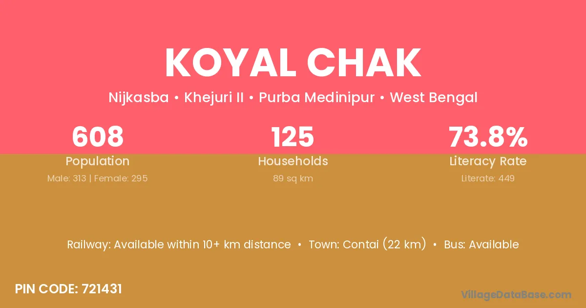 Contai (22 km) is the nearest town to Koyal Chak village for major economic activities and is located approximately 22 km away.