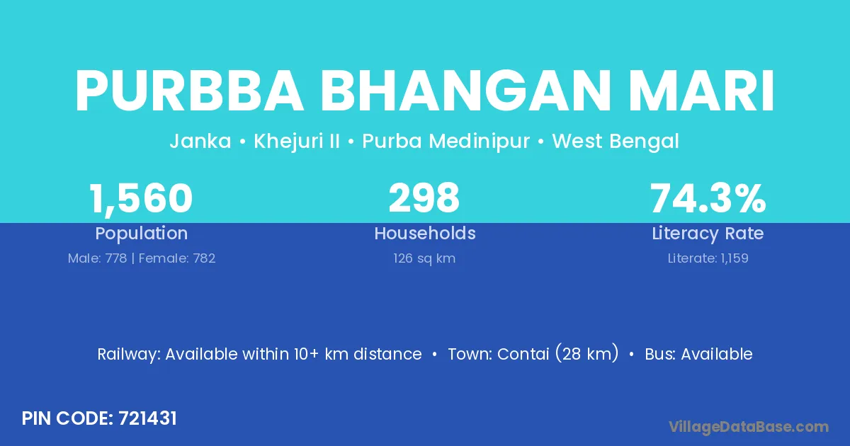 Contai (28 km) is the nearest town to Purbba Bhangan Mari village for major economic activities and is located approximately 28 km away.