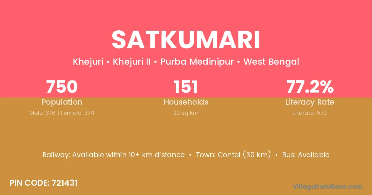 Contai (30 km) is the nearest town to Satkumari village for major economic activities and is located approximately 30 km away.