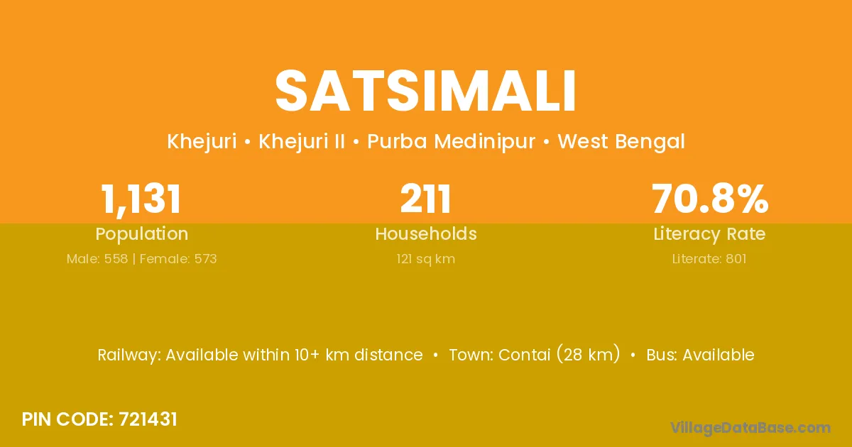Contai (28 km) is the nearest town to Satsimali village for major economic activities and is located approximately 28 km away.
