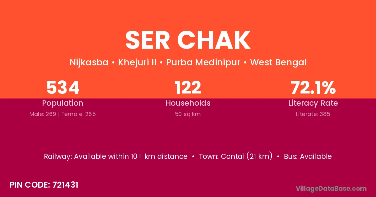 Contai (21 km) is the nearest town to Ser Chak village for major economic activities and is located approximately 21 km away.