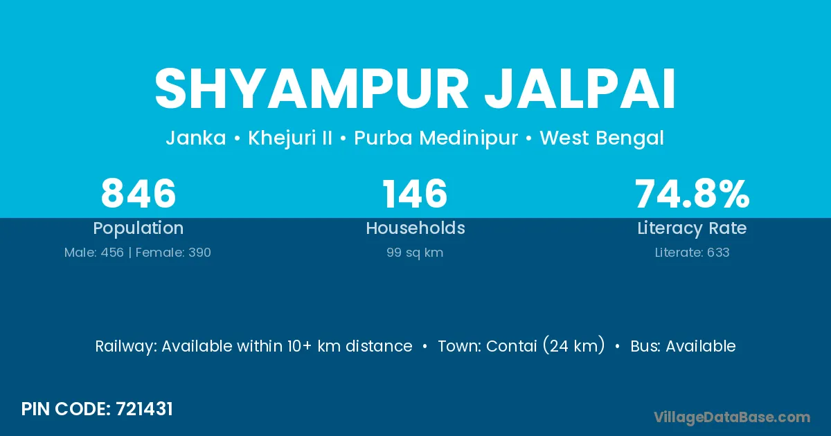 Contai (24 km) is the nearest town to Shyampur Jalpai village for major economic activities and is located approximately 24 km away.