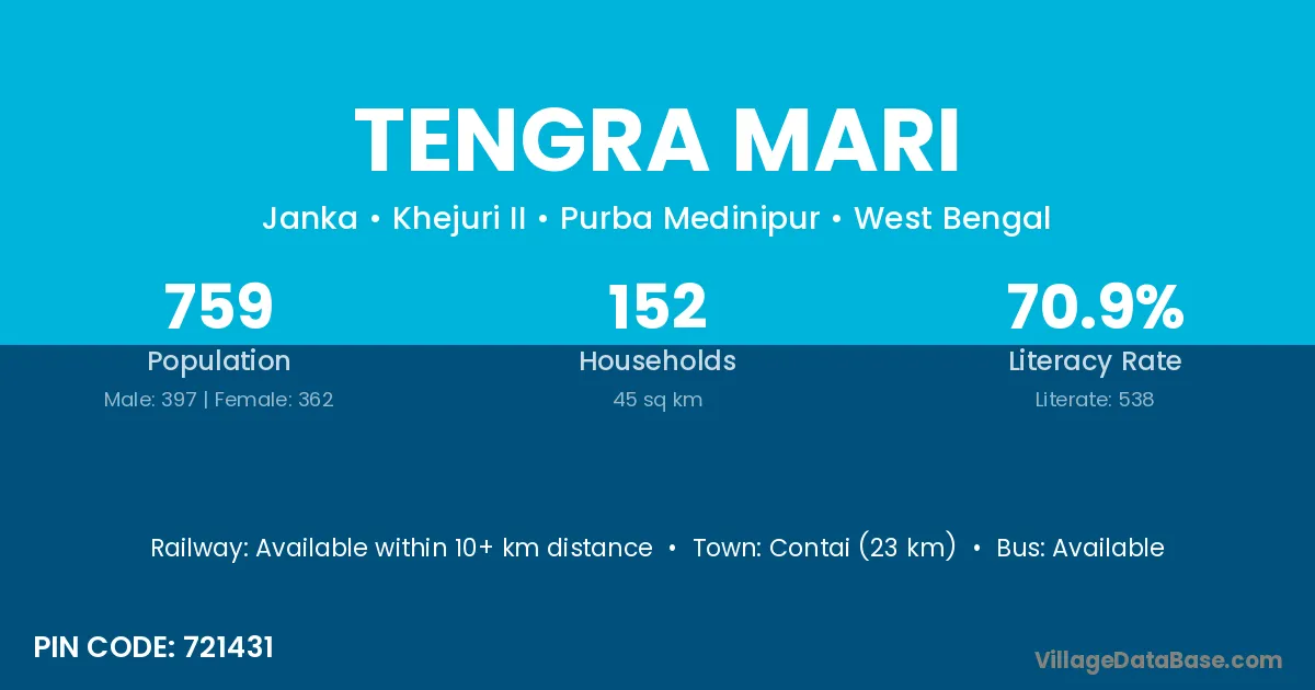 Contai (23 km) is the nearest town to Tengra Mari village for major economic activities and is located approximately 23 km away.