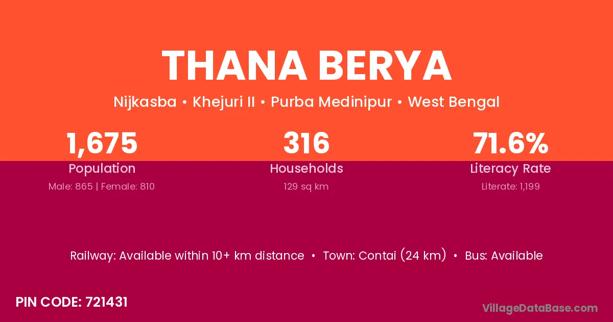Contai (24 km) is the nearest town to Thana Berya village for major economic activities and is located approximately 24 km away.