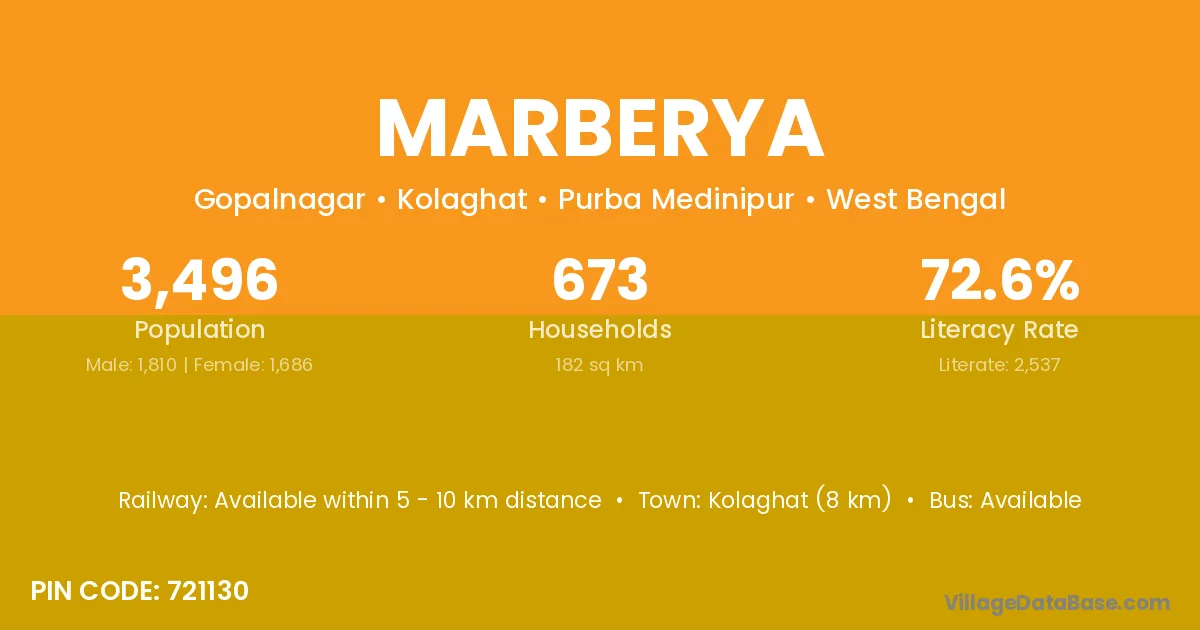 Kolaghat (8 km) is the nearest town to Marberya village for major economic activities and is located approximately 8 km away.