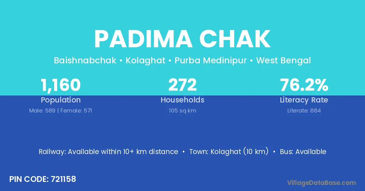 Kolaghat (10 km) is the nearest town to Padima Chak village for major economic activities and is located approximately 10 km away.