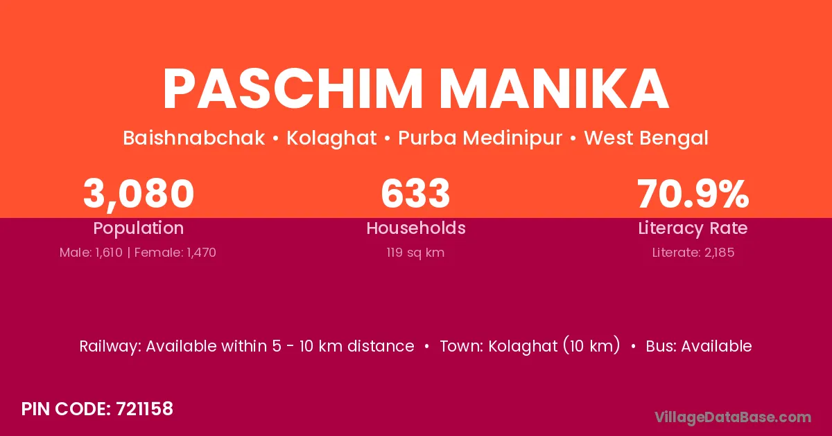 Paschim Manika village is located in the Kolaghat Subdivision of the Purba Medinipur district in West Bengal.