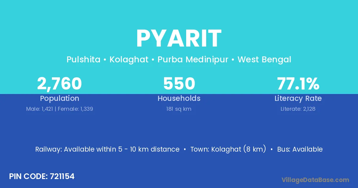 Kolaghat (8 km) is the nearest town to Pyarit village for major economic activities and is located approximately 8 km away.