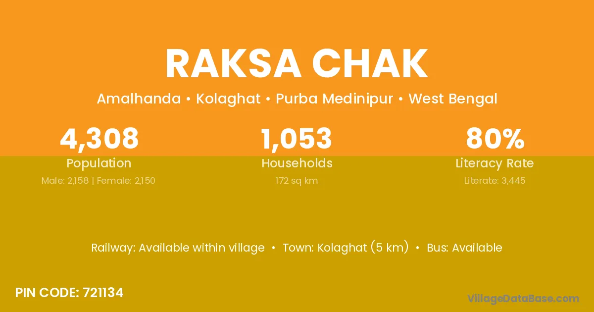 Kolaghat (5 km) is the nearest town to Raksa Chak village for major economic activities and is located approximately 5 km away.
