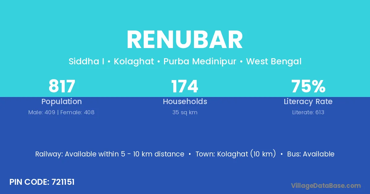 Kolaghat (10 km) is the nearest town to Renubar village for major economic activities and is located approximately 10 km away.