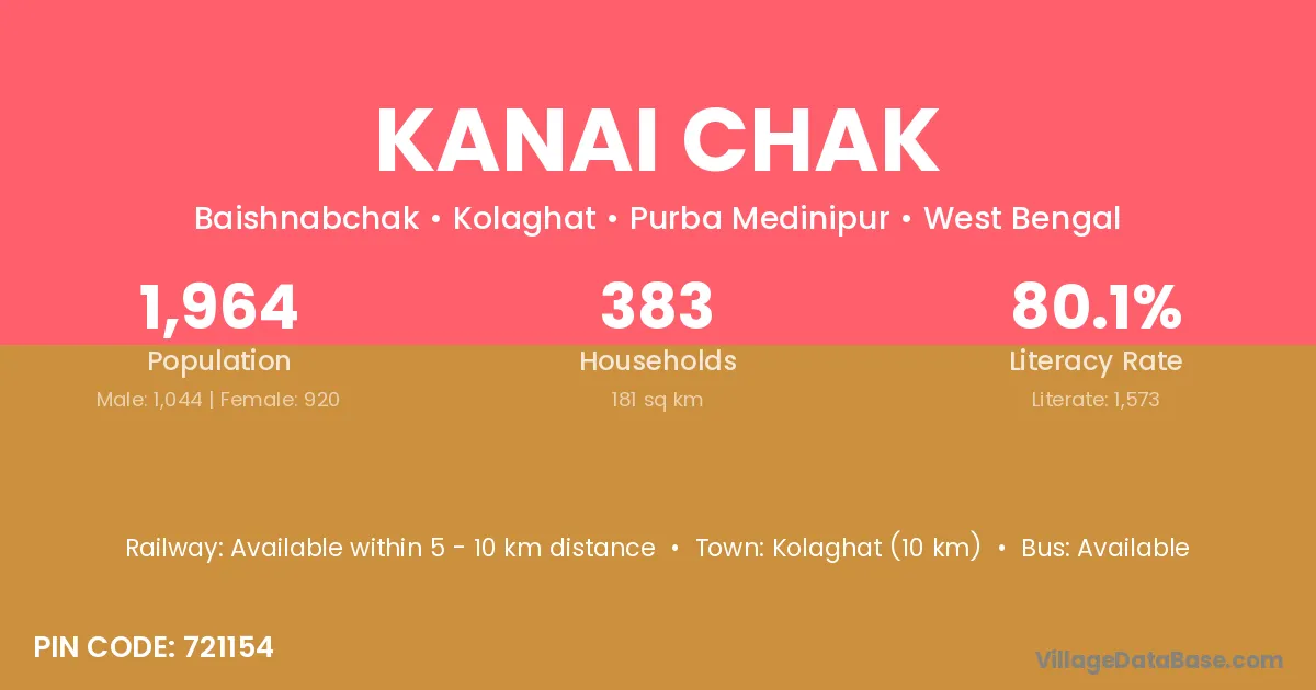 Kolaghat (10 km) is the nearest town to Kanai Chak village for major economic activities and is located approximately 10 km away.
