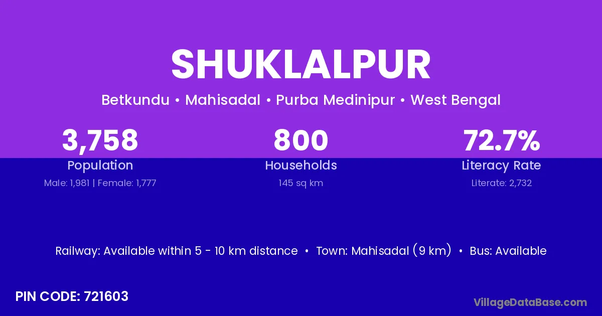 Mahisadal (9 km) is the nearest town to Shuklalpur village for major economic activities and is located approximately 9 km away.