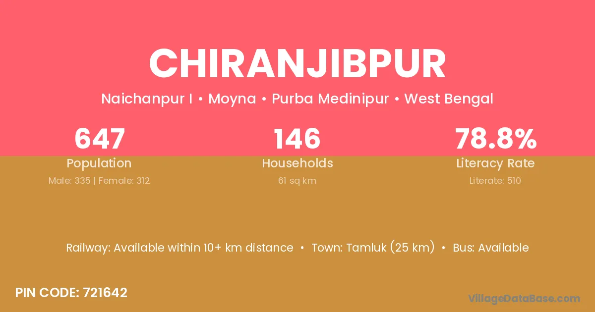 Tamluk (25 km) is the nearest town to Chiranjibpur village for major economic activities and is located approximately 25 km away.