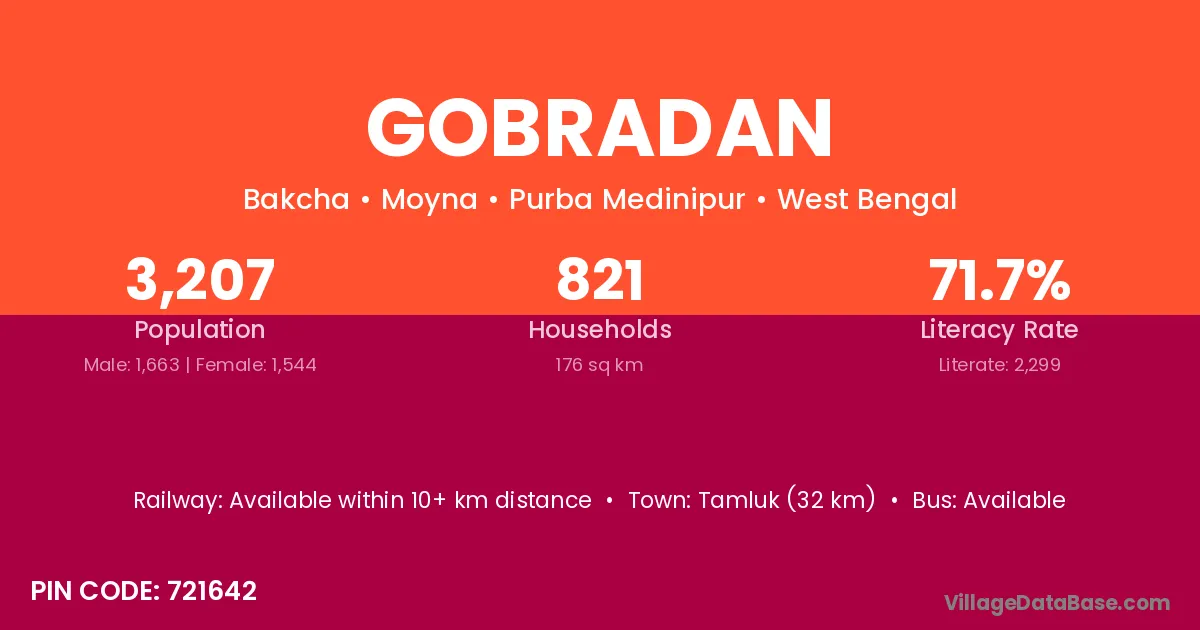 Tamluk (32 km) is the nearest town to Gobradan village for major economic activities and is located approximately 32 km away.