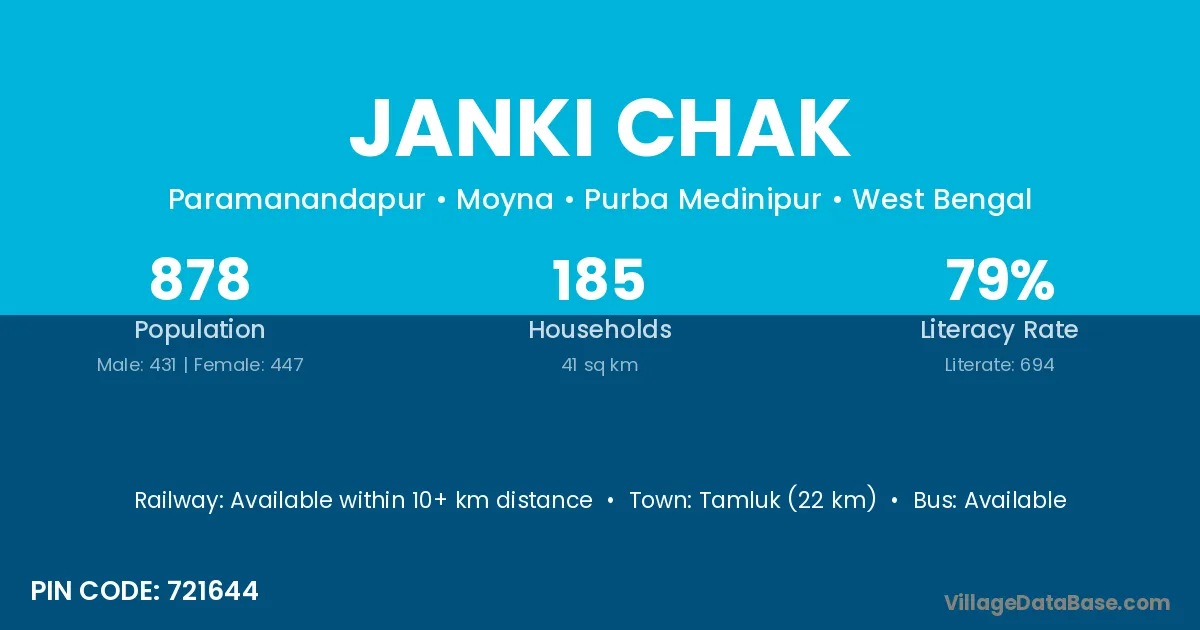 Tamluk (22 km) is the nearest town to Janki Chak village for major economic activities and is located approximately 22 km away.