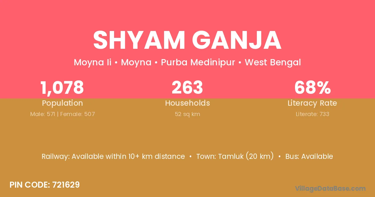 Tamluk (20 km) is the nearest town to Shyam Ganja village for major economic activities and is located approximately 20 km away.