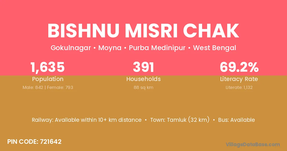 Tamluk (32 km) is the nearest town to Bishnu Misri Chak village for major economic activities and is located approximately 32 km away.