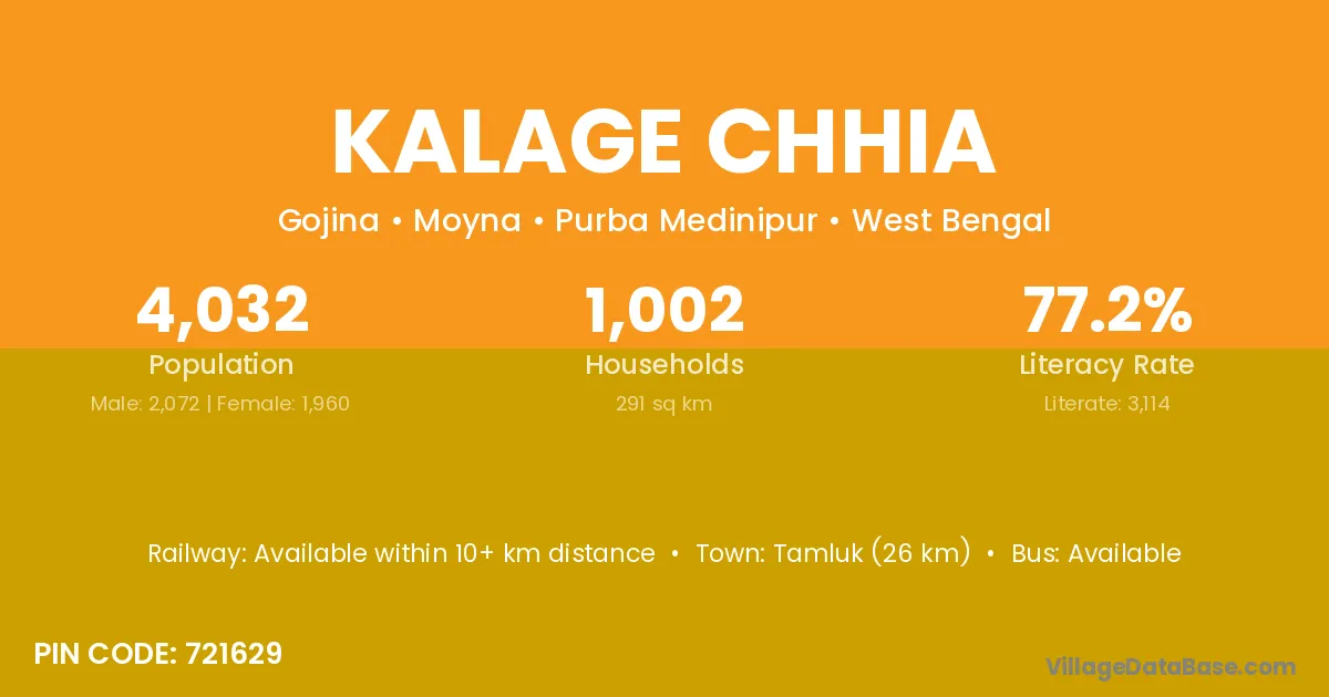 Tamluk (26 km) is the nearest town to Kalage Chhia village for major economic activities and is located approximately 26 km away.