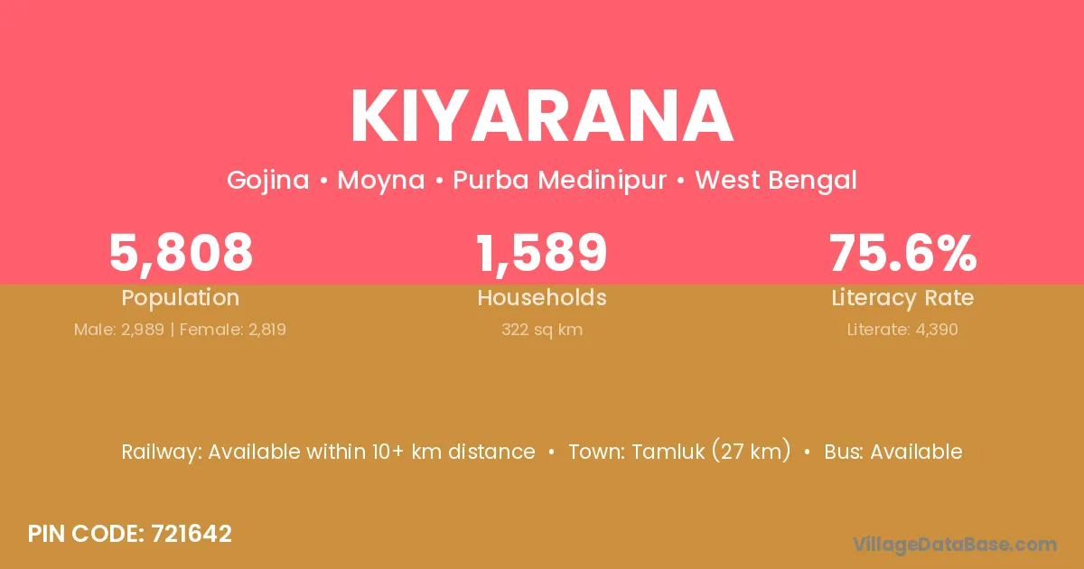 Tamluk (27 km) is the nearest town to Kiyarana village for major economic activities and is located approximately 27 km away.