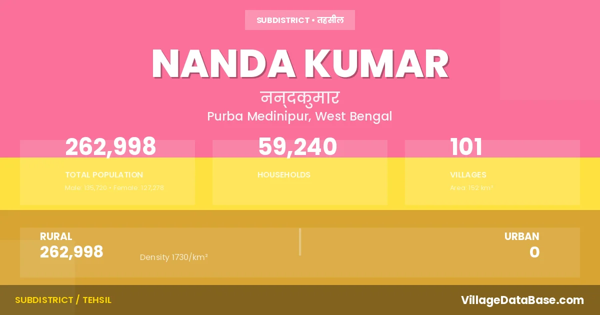 According to the 2011 census The total area of Nanda Kumar Subdivision is 152 km², with a population of 262998 people. The population density is 1,730 inhabitants per square kilometre, and there are approximately 59240 houses in the sub district.