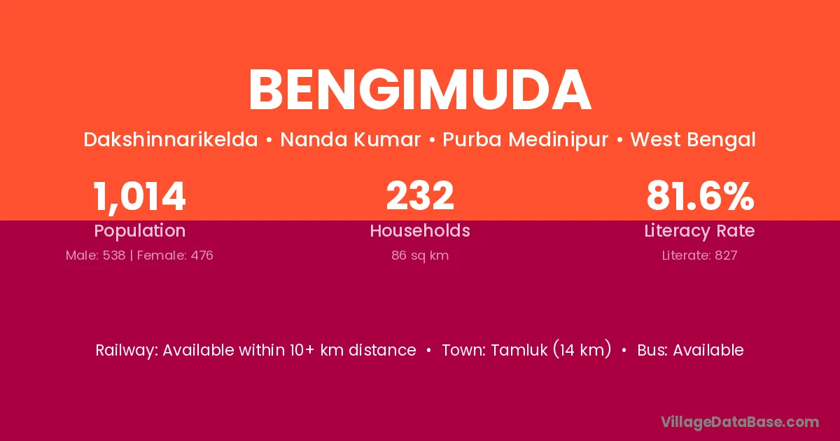Tamluk (14 km) is the nearest town to Bengimuda village for major economic activities and is located approximately 14 km away.