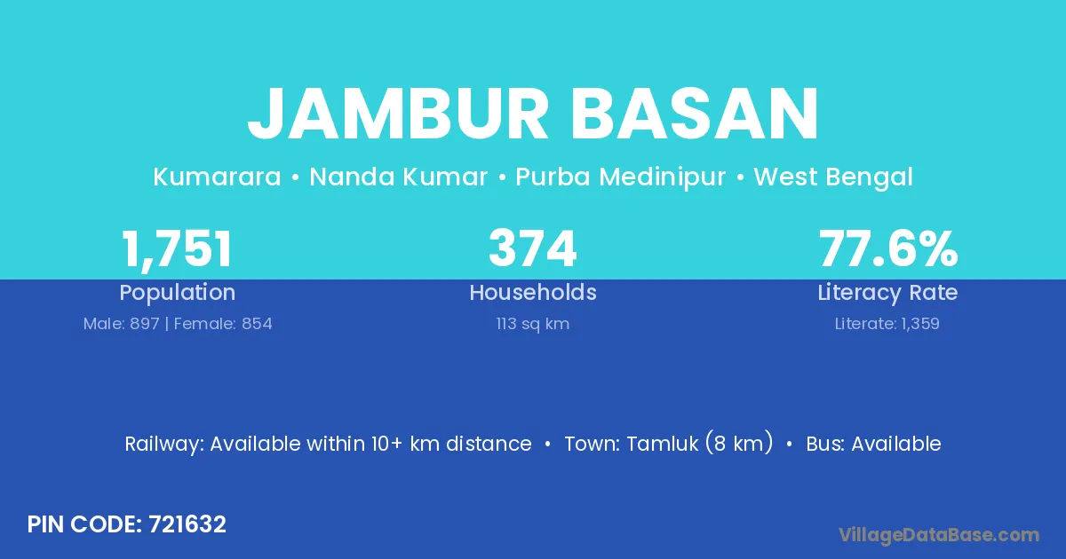 Tamluk (8 km) is the nearest town to Jambur Basan village for major economic activities and is located approximately 8 km away.