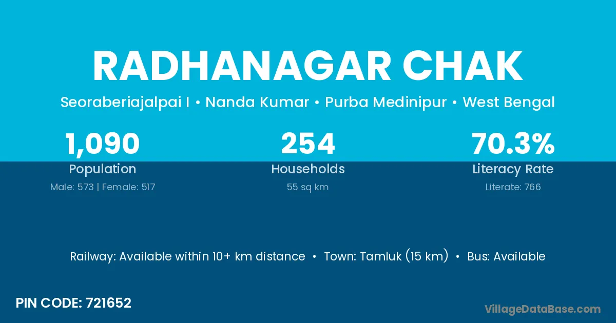Tamluk (15 km) is the nearest town to Radhanagar Chak village for major economic activities and is located approximately 15 km away.