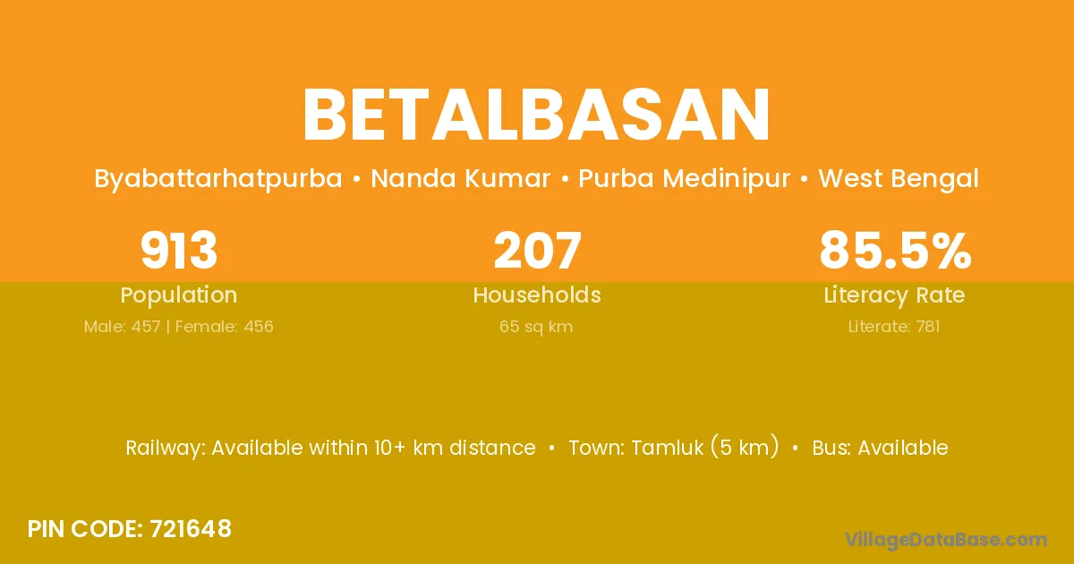 Tamluk (5 km) is the nearest town to Betalbasan village for major economic activities and is located approximately 5 km away.