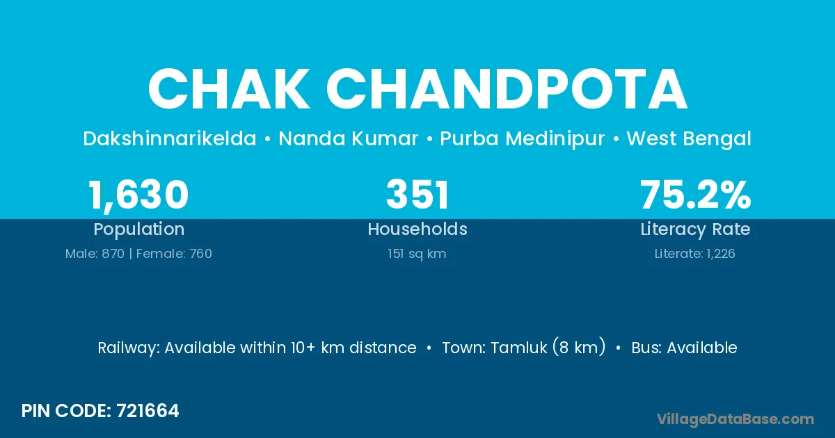 Tamluk (8 km) is the nearest town to Chak Chandpota village for major economic activities and is located approximately 8 km away.