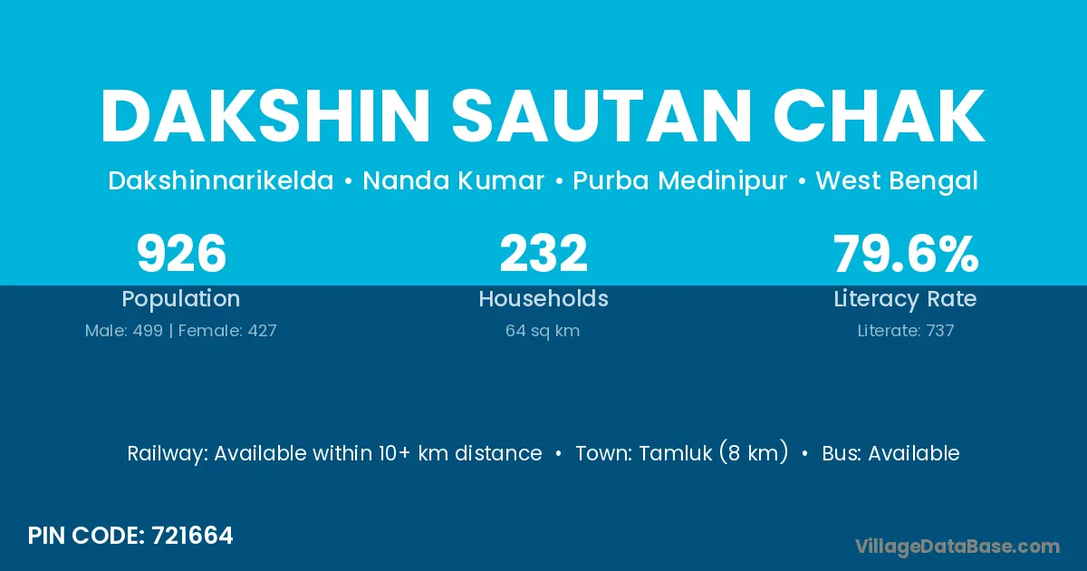 Tamluk (8 km) is the nearest town to Dakshin Sautan Chak village for major economic activities and is located approximately 8 km away.