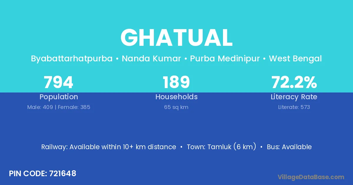 Tamluk (6 km) is the nearest town to Ghatual village for major economic activities and is located approximately 6 km away.