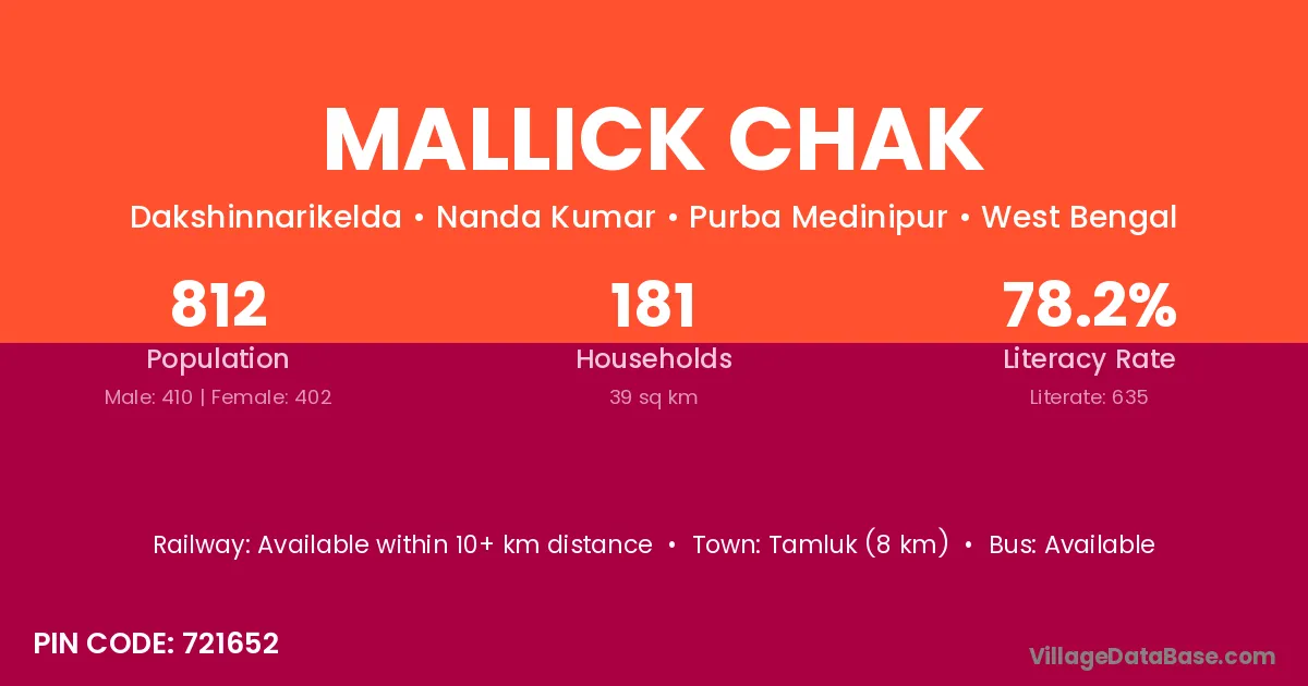 Tamluk (8 km) is the nearest town to Mallick Chak village for major economic activities and is located approximately 8 km away.